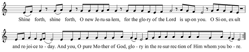 Jérusalem nouvelle, recevez la lumière, car la gloire du Seigneur s’est levée sur vous. Réjouissez-vous, ô Sion, et faites retentir des chants d’allégresse ; et vous, Très-pure Mère de Dieu, glorifiez-vous de la résurrection de votre Fils.